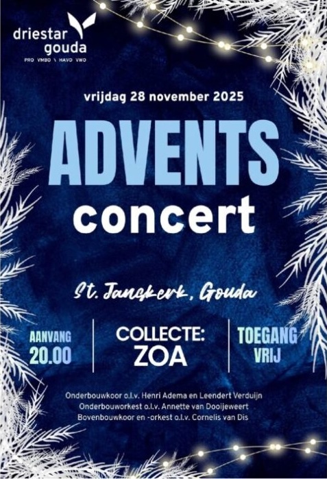 Op 28 november vindt het jaarlijkse kerstconcert van Driestar College plaats, door veel leerlingen uit de onderbouw en bovenbouw. Het concert begint om 20.00 uur en de toegang is vrij. Er is een collecte voor ZOA.
