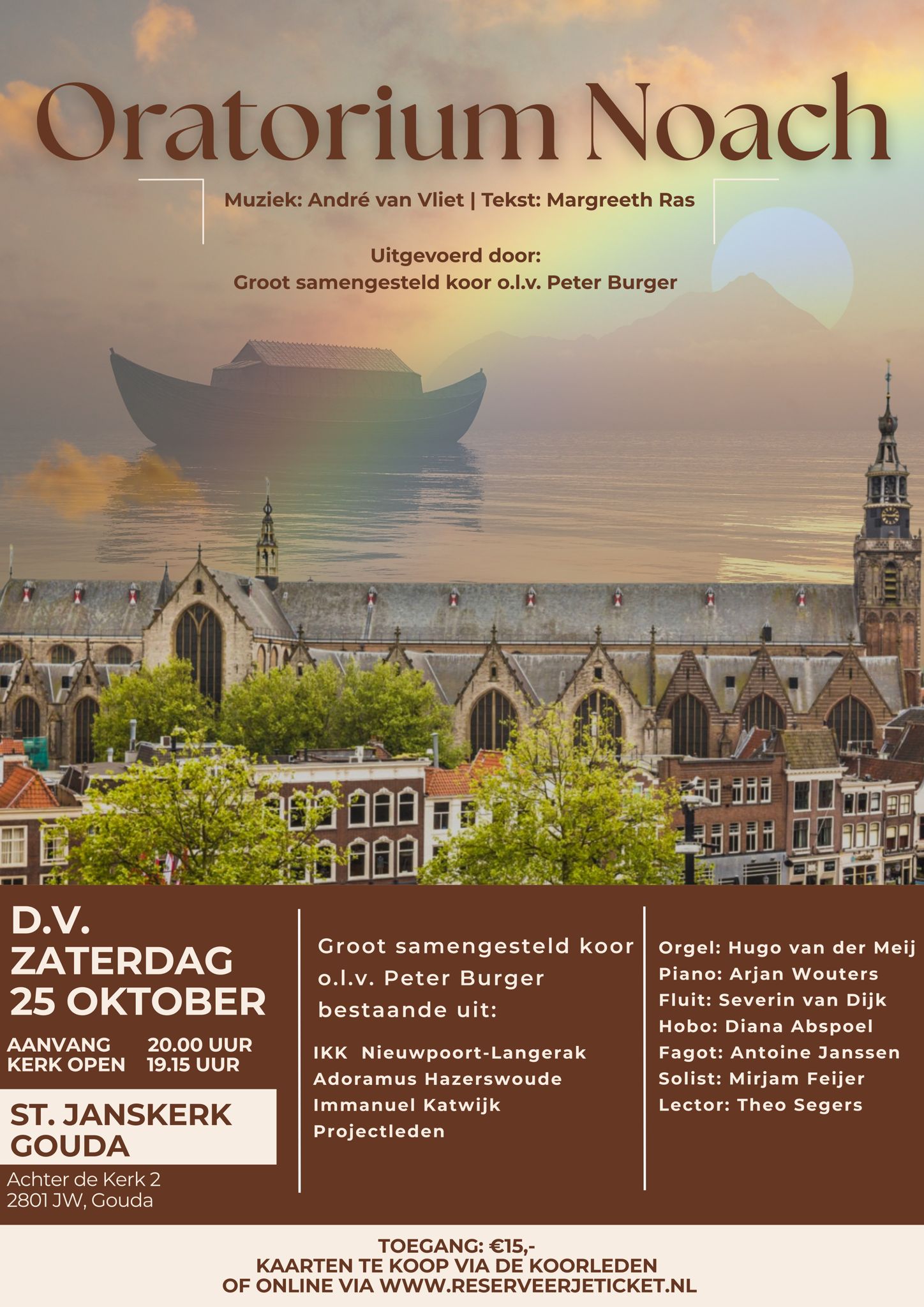 Een Groot samengesteld koor o.l.v. dirigent Peter Burger voert op 25 oktober 2025 het oratorium “Noach” uit in de Sint-Janskerk van Gouda. De muziek voor dit oratorium is geschreven door André van Vliet. De teksten heeft Margreeth Ras-van Slooten geschreven. De toegankelijke en zeer goed in het gehoor liggende muziek en de indringende teksten vullen elkaar naadloos aan. Het verhaal gaat over doorzetten, gehoorzaam zijn en hopen op een goede afloop. Een verhaal over opnieuw beginnen. Vanuit het Bijbelverhaal worden er lijnen getrokken naar de Here Jezus en naar ons leven in het hier en nu.